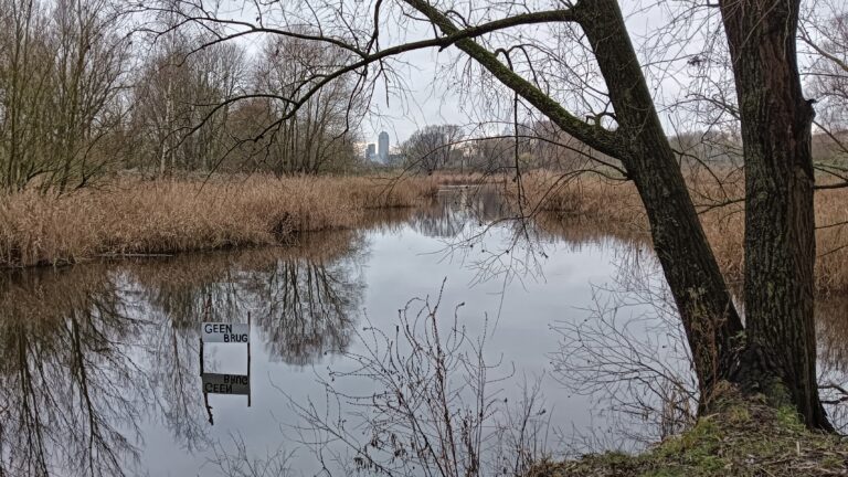 De foto maakte ik in het natuurgebiedje nabij wijk De Esch, dat dreigt te verdwijnen door de bouw van de zogenoemde derde brug over de Maas. De omwonenden en wandelaars willen, o.a. om die reden, geen brug (zie bordje) maar een tunnel. Wat zou de rivier willen?